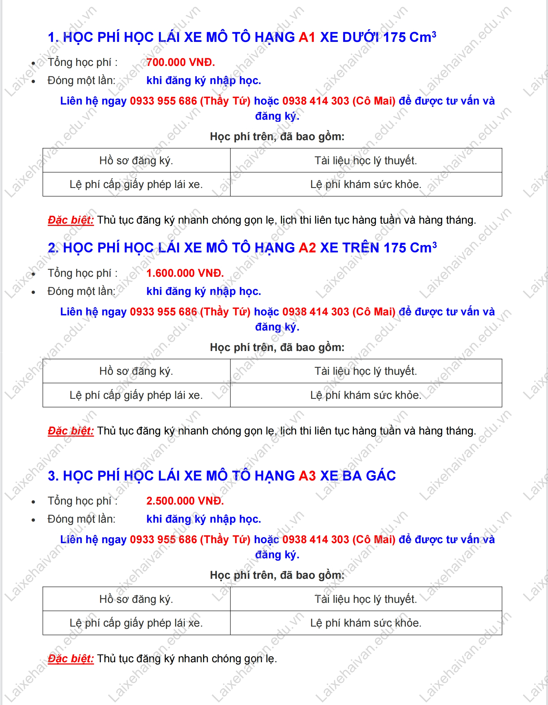 HỌC PHÍ HỌC LÁI XE MÔ TÔ A1, A2, A3
